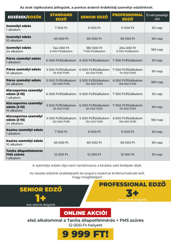 Az első alkalommal ezt kapod: állapotfelmérés = testösszetétel mérés (Tanita) + mozgásminta szűrés (FMS) + konzultáció.